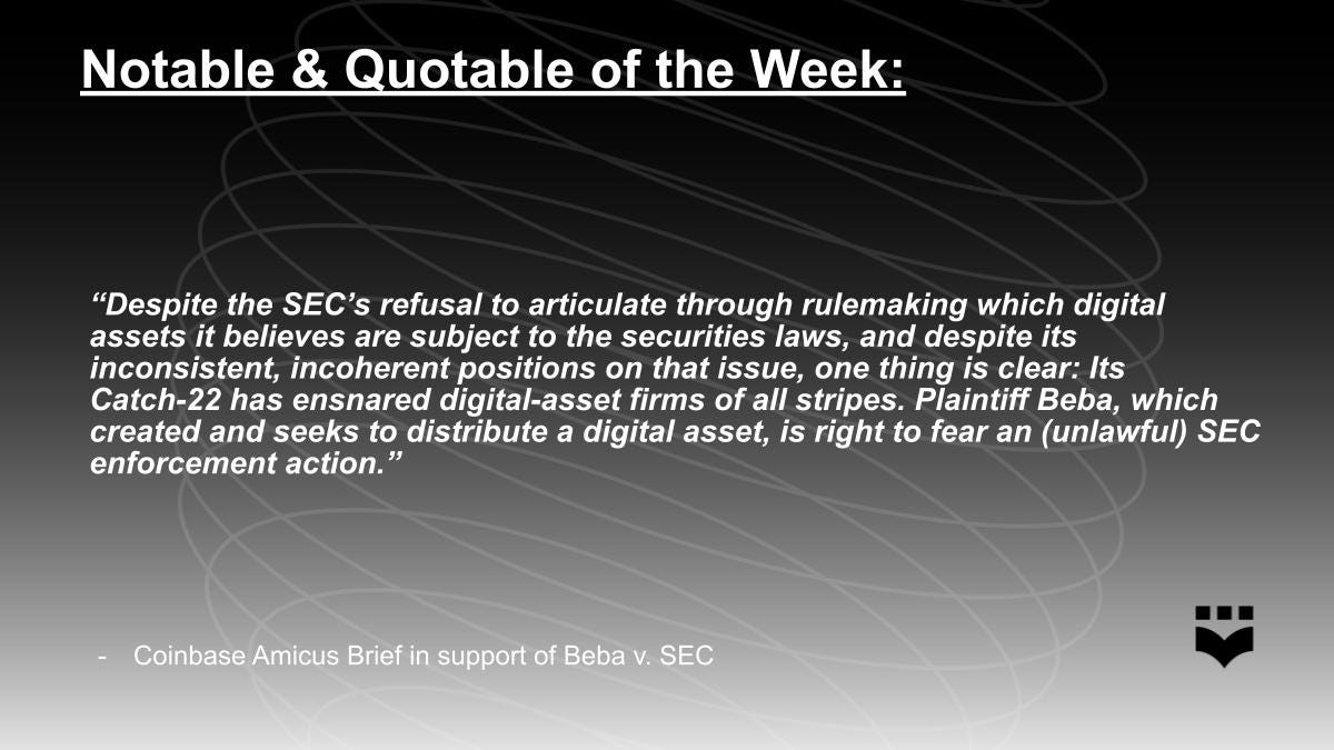In its amicus brief, Coinbase argues that the SEC’s enforcement approach has created an unworkable regulatory environment for digital asset companies like Beba, effectively placing them in a “Catch-22.” Coinbase highlights that in 2021, the SEC allowed it to go public without raising concerns that digital assets available for trade on its platform are unregistered securities. Since then, the SEC has loudly asserted that most digital assets meet the criteria of securities without providing formal rulemaking or industry guidance. In 2022, Coinbase filed a petition for rulemaking to seek regulatory clarity, but the SEC dismissed the request without addressing the fundamental issues, making compliance nearly impossible for digital asset firms. Instead of responding by providing clear guidance or rulemaking, the SEC has pursued a “regulation-by-enforcement” strategy. Coinbase also highlights the SEC’s deeply inconsistent views on digital assets by presenting the court with examples of the SEC’s numerous conflicting statements in recent years. Coinbase characterizes the current regulatory environment as a “Catch-22” for digital asset companies in that they are expected to comply with rules that are inapplicable and unworkable, with no formalized pathway to achieve compliance. Given this regulatory bind, Coinbase supports Beba’s request for declaratory relief, asking the court to formally recognize that digital assets are generally not “investment contracts” under existing securities laws, providing needed clarity for the digital asset industry.