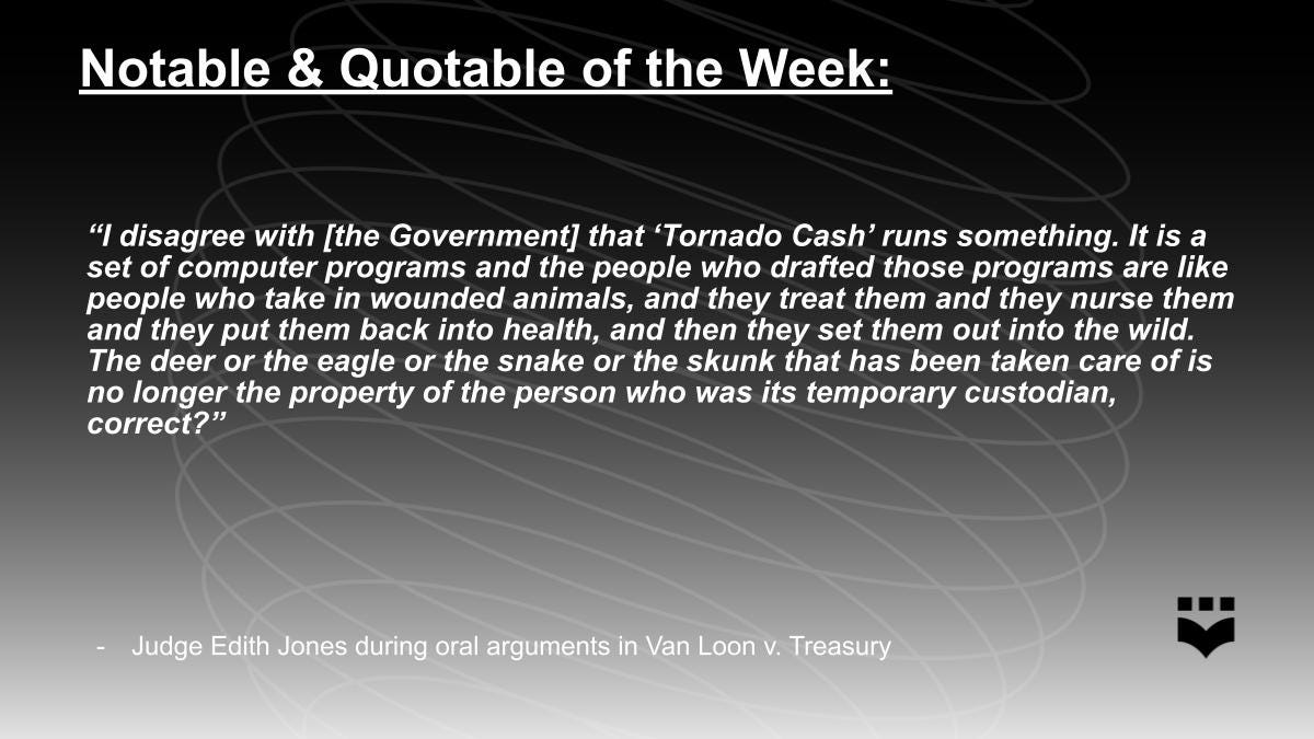 In the oral arguments, Judge Edith Jones challenged the assertion that Tornado Cash smart contracts are a sanctionable entity and contended that the Treasury’s sanctions seemed to be “a solution in search of an entity.” She stated, “I disagree with [the Government] that ‘Tornado Cash’ runs something. It is a set of computer programs and the people who drafted those programs are like people who take in wounded animals, and they treat them and they nurse them and they put them back into health, and then they set them out into the wild. The deer or the eagle or the snake or the skunk that has been taken care of is no longer the property of the person who was its temporary custodian, correct?” Given this understanding, Judge Jones turned to the question of a third-party’s use of software and asked the Treasury, “Why don’t you shut down your tax software because it can be used to commit fraud on the part of foreign entities?”