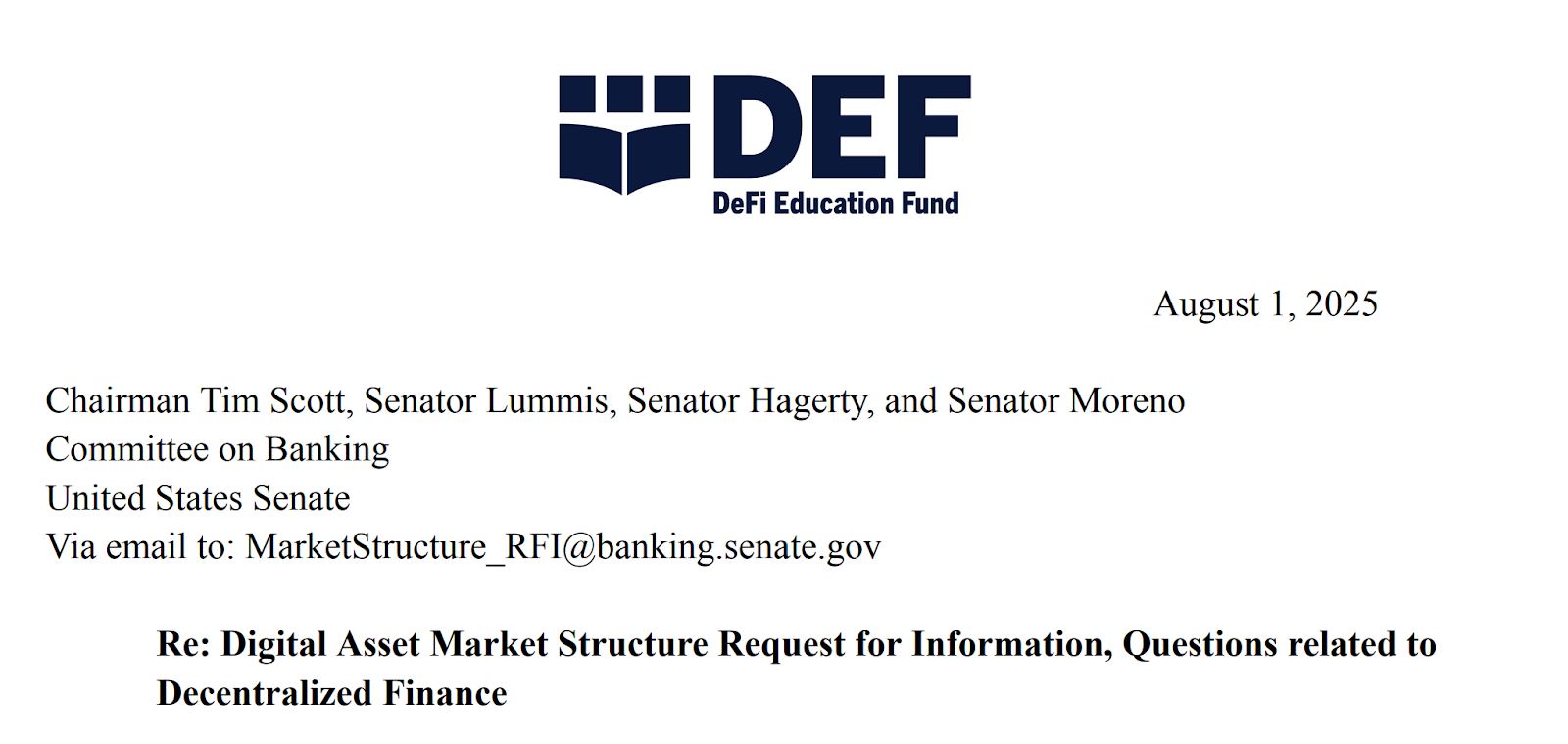 On August 1, 2025, DEF submitted a response to the Senate Banking Committee’s Digital Asset Market Structure Request for Information (RFI) and discussion draft of the Responsible Financial Innovation Act of 2025 (RFIA). We focused on questions directly relevant to DeFi, protecting software developers, and self-custody.