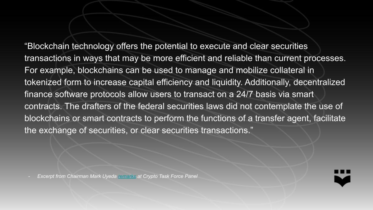 As background, in February 2025, SEC Commissioner Hester Peirce issued a request for comment: “There Must Be Some Way out of Here.” In the request for information, Commissioner Peirce requested public feedback on a potential safe harbor from registration under the Securities Act of 1933. Back in 2021, Commissioner Peirce proposed that the Commission put in place a non-exclusive safe harbor to provide a time-limited exemption from the registration requirements under the Securities Act of 1933 for offers and sales of tokens during the development of a functional or decentralized blockchain network.