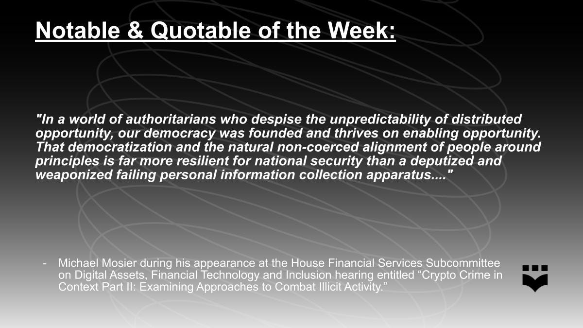 Witness Michael Mosier, Co-Founder of Arktouros and co-author of a recently-published paper on a conceptual framework for combating illicit finance in DeFi, explained the limitations of building a AML/CFT regulatory framework based on existing tools and regulatory obligations, including Know Your Customer KYC (KYC) measures. Mosier argued against the blanket application of financial institution standards to all elements of blockchain networks, as “treating every gear of code in a technological network as a financial institution… overestimates the safety of financial institutions and the effectiveness of KYC.” “The original anonymity-enhanced technology is cross-border fiat banking with nested accounts and shell companies,” Mosier continued. Additionally, in response to a question from Chairman Hill about why applying Bank Secrecy Act (BSA) requirements to miners and validators does not make sense, Mosier said that “…miners and validators are essentially producing blocks and verifying blocks… It’s not something that we would subject to KYC… it’s essentially a random process of allocation of processing data… There are no customers… It’s mathematical processing… it just would not be effective.”