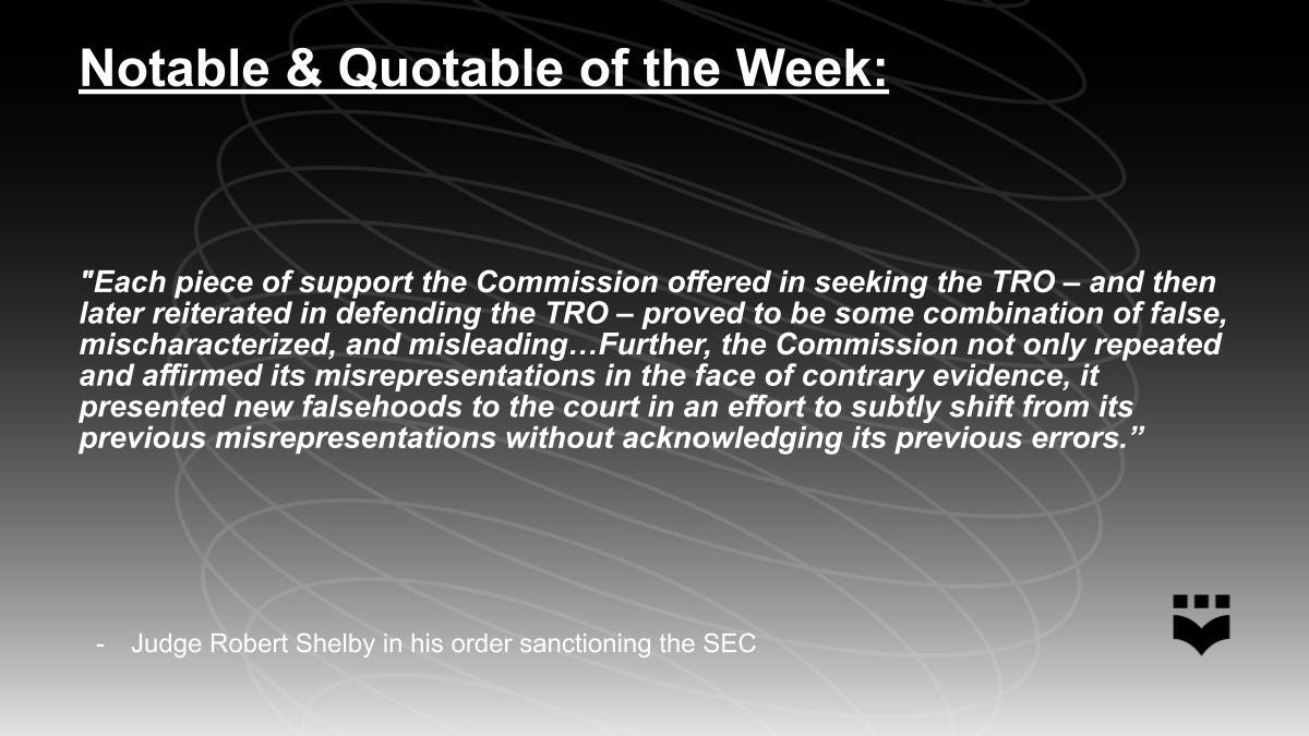 Last Monday, a federal district court took the rare step of imposing sanctions on the SEC in a crypto case because the “pervasive misconduct” by the agency “demonstrates a pattern of organizational bad faith and broadly implicates the Commission itself—not just isolated individuals.”