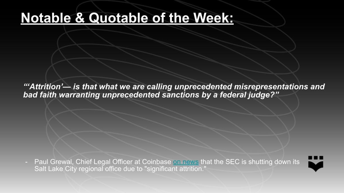 Now that briefing is wrapped up, we will soon have an answer from the appellate court as to whether the SEC will be ordered to engage in rulemaking. This effort by Coinbase adds to the industry’s proactive approach to gaining regularity clarity and evidences the industry does want clear, workable rules. While legislative efforts like FIT 21 could bring clarity to the SEC’s jurisdiction over crypto, until a bill is signed into law, the SEC’s jurisdiction will largely be decided through the court system.