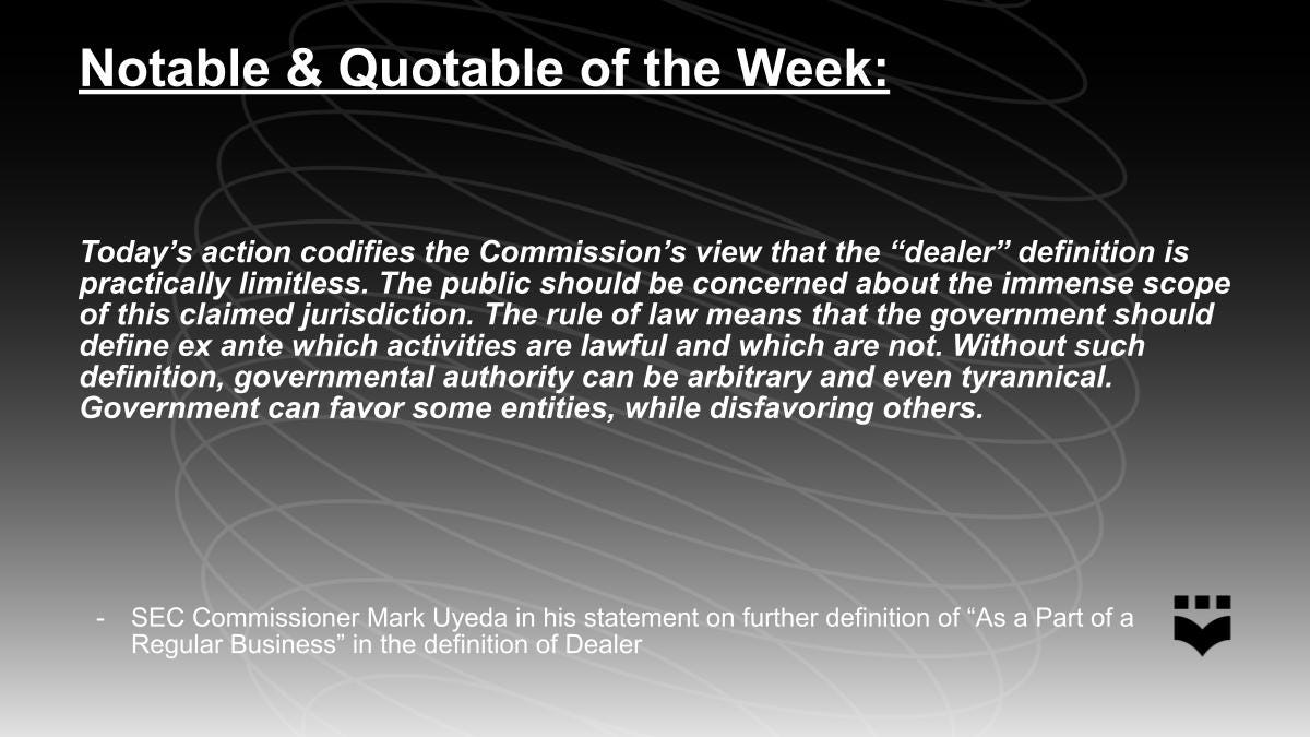 Last Tuesday, the Securities and Exchange Commission (SEC) finalized two rules in a 3-2 vote to clarify which market activities would qualify a person or entity to be a “dealer” under the federal securities laws. The final rule requires those who participate in securities markets or engage in “certain dealer roles, in particular those who take on significant liquidity-providing roles in the markets,” to register with the SEC, join a self-regulatory organization, and comply with federal securities regulations. Furthermore, any liquidity provider, regardless if they deal in traditional finance (TradFi) or DeFi, must register as a “dealer” with the SEC if they control over $50 million in capital.