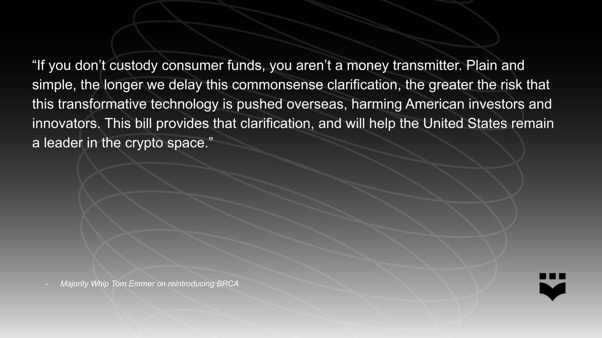 For DEF’s one-page summary of the BRCA, click here. For background on the history and design of the BSA, its application to crypto, and why software providers and noncustodial operators across the technology stack are not subject to the BSA read DEF’s article written by Lizandro Pieper and Gavin Zavatone: “Square Peg in a Round Hole: Why the Bank Secrecy Act Should Not Apply to Blockchain Participants.“