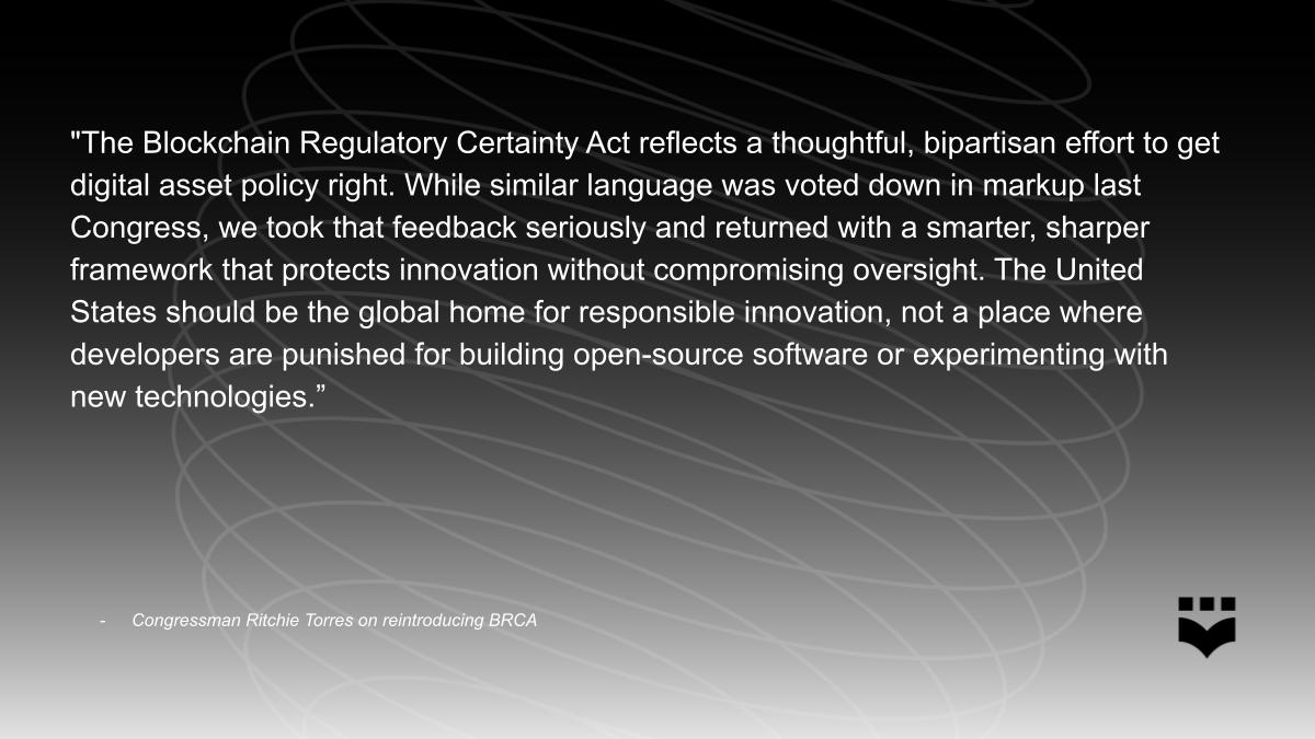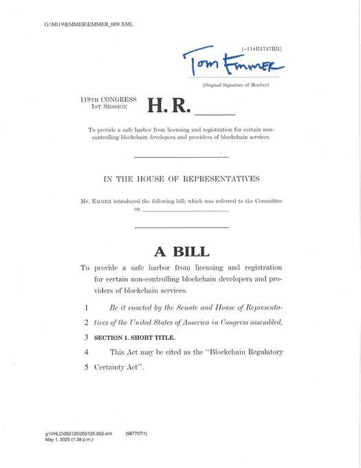 On Wednesday, May 21, 2025, House Majority Whip Tom Emmer (R-MN) re-introduced the bipartisan Blockchain Regulatory Certainty Act (BRCA) to the 119th Congress with co-sponsor Representative Ritchie Torres (D-NY).