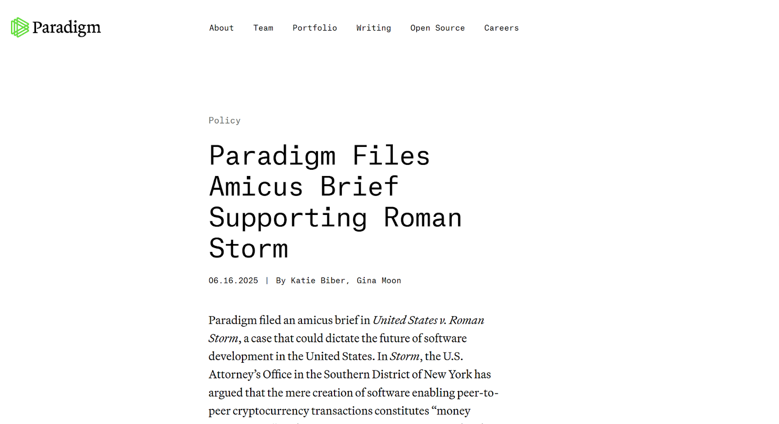 On June 13, 2025, Paradigm filed an amicus brief in United States v. Roman Storm, supporting the inclusion of key jury instructions related to the allegation Storm operated an unlicensed money transmitting business (MTB). In the indictment, the government claims that Storm, co-founder of Tornado Cash, operated an unlicensed MTB under criminal code provision 18 U.S.C. 1960 simply by writing and publishing noncustodial software that enabled users to engage in p2p transactions.