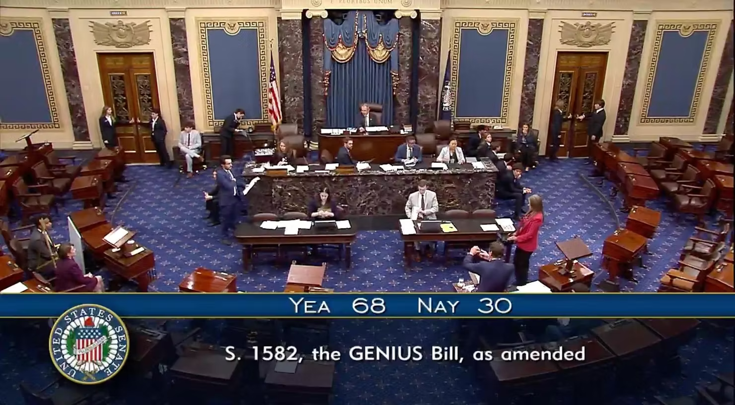 On June 17, 2025, the United States Senate officially passed the Guiding and Establishing National Innovation for U.S. Stablecoins (GENIUS) Act of 2025 with a bipartisan supermajority vote of 68-30. The GENIUS Act aims to establish a federal framework for the issuance and regulation of payment stablecoins in the U.S. Clear, thoughtful stablecoin policy is critical in securing the U.S.’s role as a global financial leader, and it would not be possible without the bipartisan leadership of Senators Bill Hagerty (R-TN), Cynthia Lummis (R-WY), Tim Scott (R-SC), Kirsten Gillibrand (D-NY), and Angela Alsobrooks (D-MD).