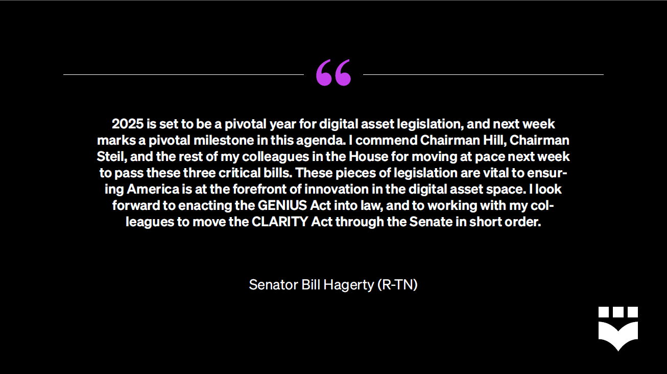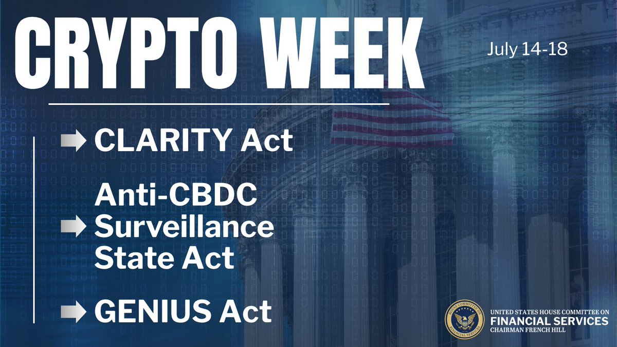 On July 3, 2025, House Financial Services Committee (HFSC) Chairman French Hill (R-AR), House Committee on Agriculture (House Ag) Chairman GT Thompson (R-PA), and House Republican Leadership announced that the week of July 14th will be “Crypto Week.” As part of Crypto Week, the House of Representatives will consider the Digital Asset Markets Clarity Act, the Anti-CBDC Surveillance State Act, and the Guiding and Establishing National Innovation in U.S. Stablecoins (GENIUS) Act as part of Congress’s efforts to make “America the crypto capital of the world.”